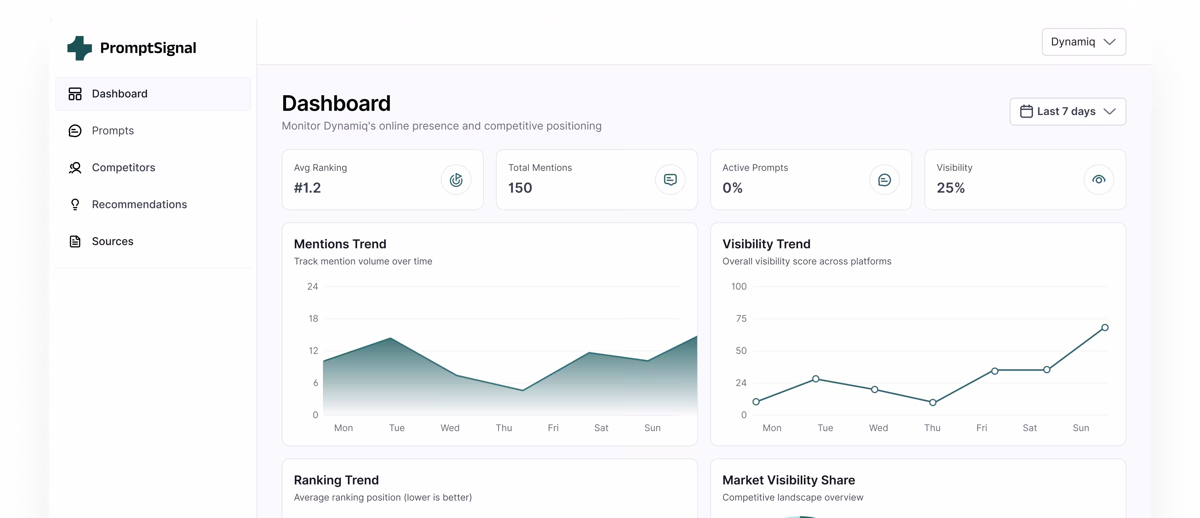 PromptSignal monitors how leading AI models mention, rank, and describe your brand, so you can measure visibility, track competitors, and optimize your positioning in AI-generated answers.