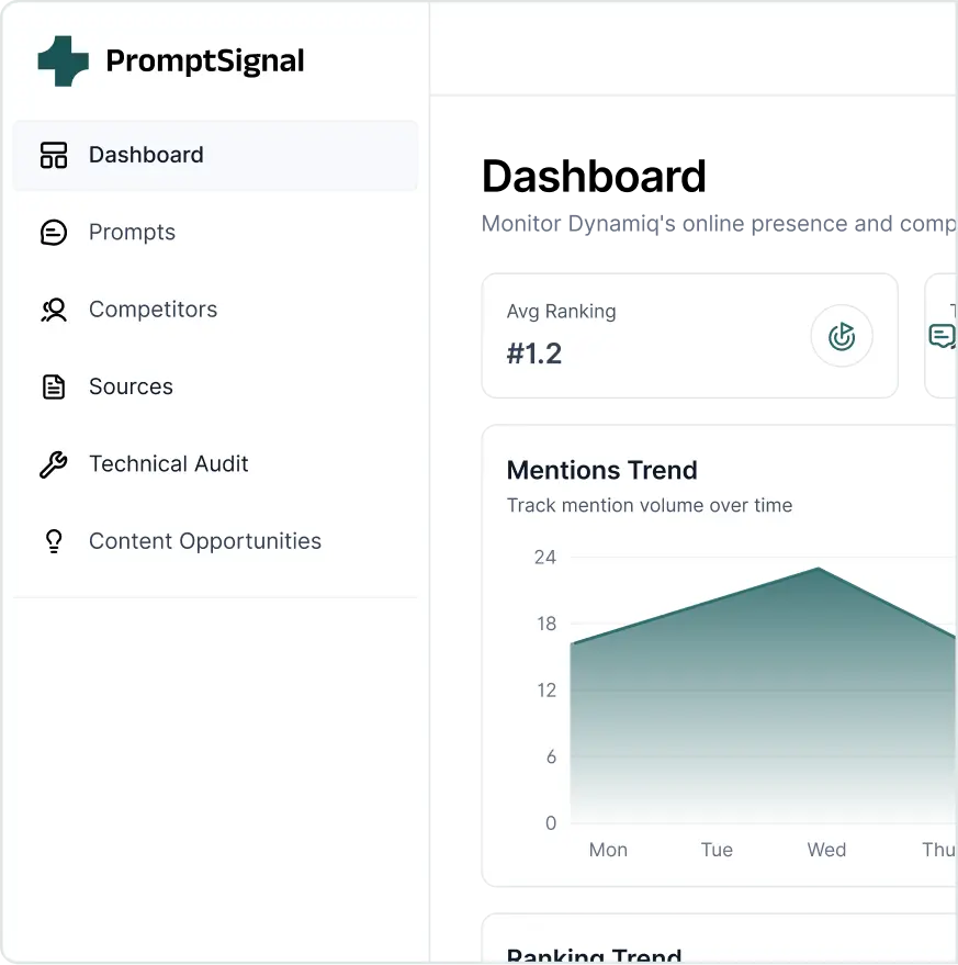 PromptSignal monitors how leading AI models mention, rank, and describe your brand, so you can measure visibility, track competitors, and optimize your positioning in AI-generated answers.